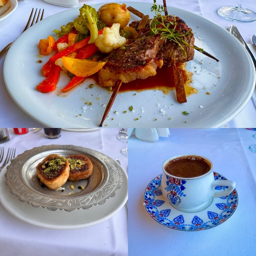 We had ordered our cocktails at 6:30 pm, and with the leisurely pace with which the food came and the drinks, and with the conversation flowing with my three amazing dinner guests (thank you Maria, Sharon and Rameez), the time disappeared. It was 10:30 pm before we knew it, and our surrounding scenery has changed from a stunning blue sky, to a magical vista of sparkling lights and sounds of Istanbul at night. The Blue Mosque at this stage of the evening was simply stunning. Photographs or videos could not do justice to the amazing location – if you are ever in Istanbul you must eat here!