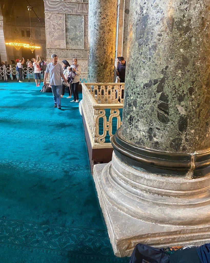 The central dome is 32 m in diameter and 55 m above the floor. It seems to be suspended in the air. There are two further half domes joining the central dome, creating a massive sense of space and with beautiful lighting from some 40+ windows it is extraordinary. Once seen, never forgotten. Further inside, away from the static crowd staring in awe, it is a lovely place to just wander. A building of such magnificence in design and construction needs time to take it in. On the right hand side in the south Gallery, again for the James Bond film aficionados amongst you, you can find the base of the marble pillars where, in From Russia With Love, a key moment in the film took place with the passing of a secret message.