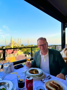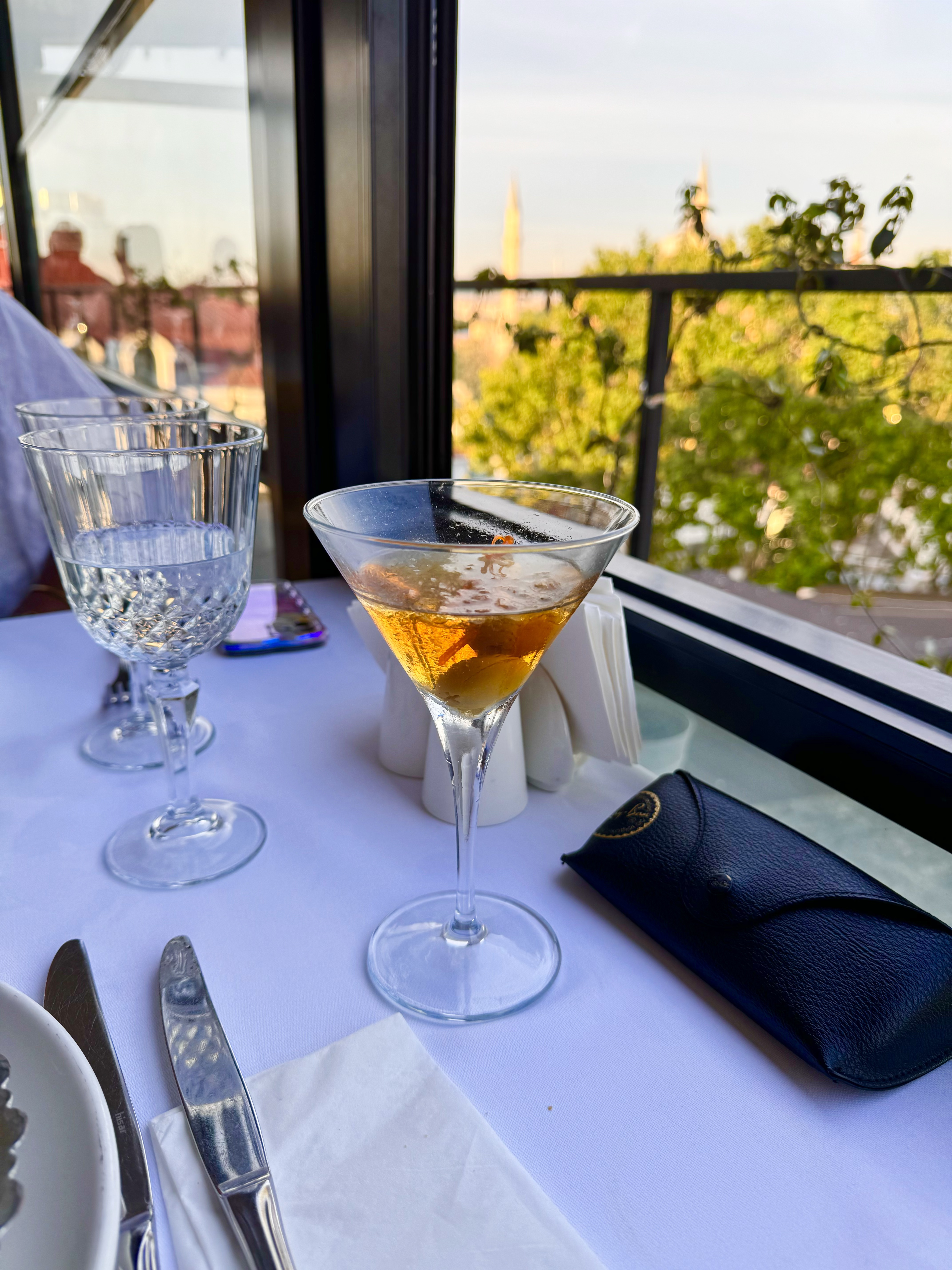 You can see the Sea of Marmara, the Bosphorus, and the Golden Horn. A simply stunning location. I ordered a dry martini, and a slice of lemon peel, but I’m not quite sure what I eventually had to drink. The vermouth was a cross between a sweet and a dry, with an orange hue, and then two olives, not a slice of lemon peel. However, at this stage of a very long day, I was not in the mood to have a disagreement with the barman, so I simply embraced the mystery!